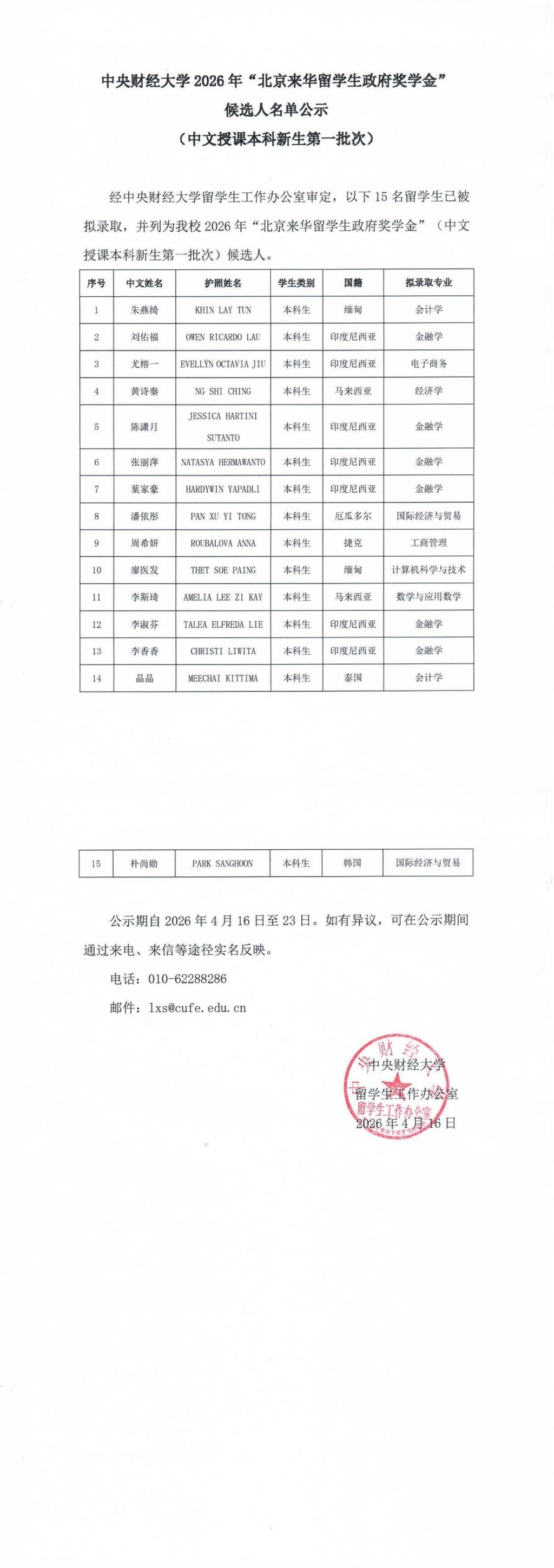 上一条: 中央财经大学2026年“北京来华留学生政府奖学金”候选人名单公示(英文授课本科新生第一批次)