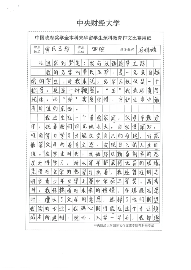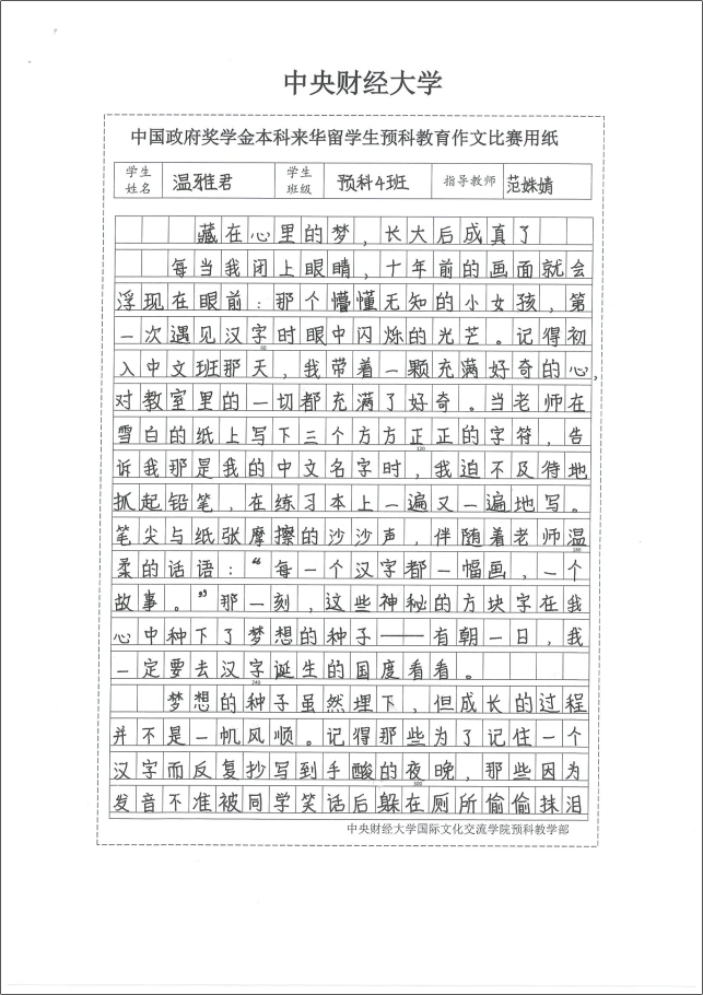此外,4月3日至16日,学院举办了“我与中文”主题作文比赛。活动面向预科班学生,鼓励他们用文字记录学习中文的心路历程和感悟。在参赛作品中,学生们分享了从初识汉字到流利表达的点滴进步,展现了中文学习带来的文化震撼与个人成长。比赛不仅见证了留学生们的学习成果,也让他们在文字中感受到中文的温度与深度。