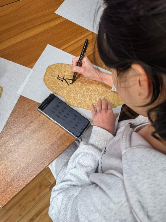 4月16日,甲骨文仿写活动在文化体验中心举行。活动由学院国际中文教育专业研究生邵诗荃主讲,她向留学生详细讲解了汉字从甲骨文到现代汉字的演变历程,并通过生动的案例展示了汉字的美学价值和文化内涵。随后,留学生们在龟壳纸上仿写甲骨文吉祥话,如“长乐未央”“五福临门”等,并与作品合影留念。留学生们纷纷表示,书写甲骨文仿佛可以让我们穿越时空,感受汉字的古老魅力。