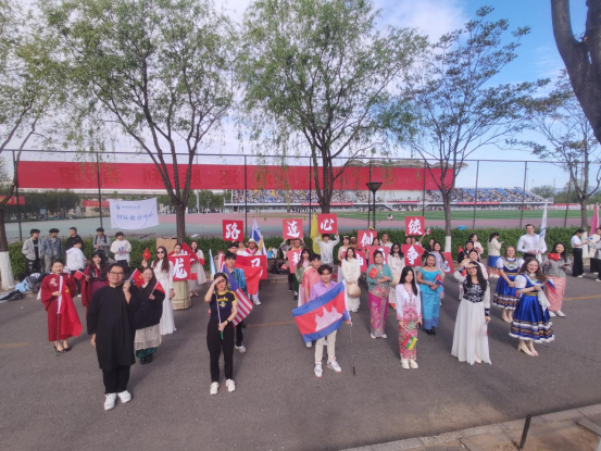 方阵中的同学们身姿挺拔,昂首阔步,展现出意气风发的精神风貌。他们身着极具本国特色的传统服饰,色彩斑斓的服饰如同多元文化碰撞出的绚丽火花,尽显世界各地的独特魅力。在行进过程中,同学们手中挥舞着鲜艳的五星红旗与各自国家的国旗,步伐坚定而自信,彰显出对不同文化的尊重与融合。当方阵行至主席台前,同学们齐声高呼“丝路连心创佳绩,龙马精神勇争先” 的响亮口号,传递出他们积极向上、勇于拼搏的决心与信念。