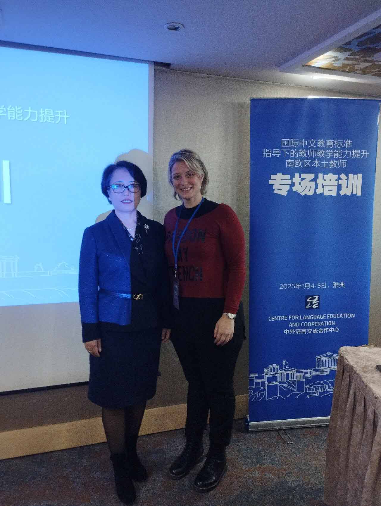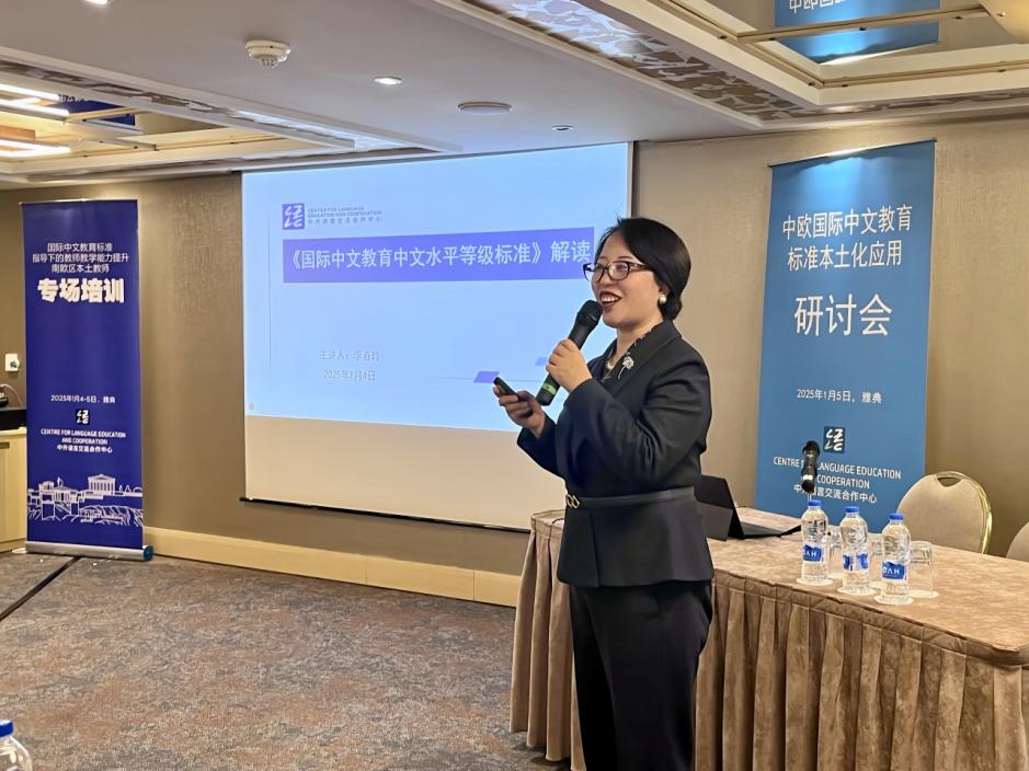 2025年1月3日-7日,国际文化交流学院院长、留学生工作办公室主任李春玲教授接受教育部中外语言交流合作中心(以下简称“语合中心”)派出,前往希腊雅典参加由语合中心主办、英国汉语考试委员会承办的“国际中文教育标准指导下的教师教学能力提升南欧区本土教师专场培训”和“中欧国际中文教育标准本土化应用研讨会”。中国驻希腊大使馆一等秘书王迎出席开班仪式并与专家学者亲切交谈。