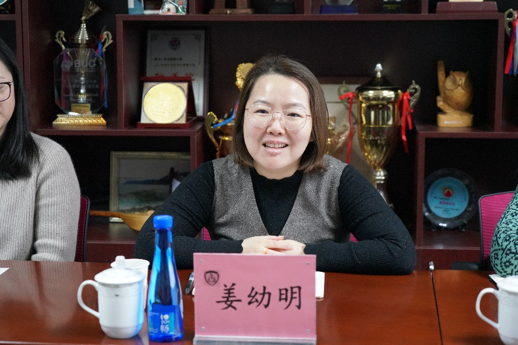 姜幼明对学院的热情欢迎表示了感谢。她介绍了北京中医药大学国际教育学院(国家中医国际传播中心)的基本情况。她表示,国际教育学院刚成立不久,此行的目的是与我校交流来华留学教育工作经验。