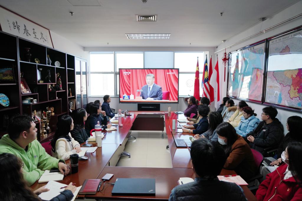 1月8日下午,国际文化交流学院直属党支部在中财大厦1032会议室召开主题党日、二级理论学习中心组(扩大)集中学习会,集体学习习近平总书记在二十届中央纪委四次全会上的重要讲话精神,第二十八次全国高校党的建设工作会议精神,并集体观看《“加强高校党建 建设教育强国”大家谈》专题节目。党支部全体党员参加了此次会议。会议由学院直属党支部书记、院长、留学生工作办公室主任李春玲同志主持。