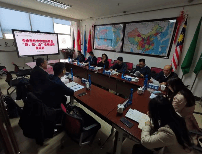 3月10日下午,我校在中财大厦1032会议室召开国际学生“政、校、企”合作培养座谈会。中国对外承包工程商会会员与培训部主任米金地,中国电建市政工程集团国际公司南亚区域部纪委书记、北京办事处主任刘亚君,国际文化交流学院院长、留学生工作办公室主任李春玲,金融学院副院长应展宇,国际经济与贸易学院副院长王立勇,管理科学与工程学院副院长陈俊华,文化与传媒学院教授谭云明以及“汉语+财经专业”硕士项目培养单位和国际文化交流学院相关工作人员出席了此次座谈会。会议由国际文化交流学院院长、留学生工作办公室主任李春玲主持。