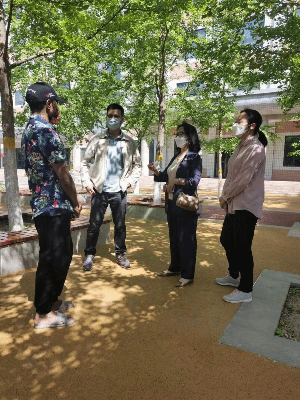 图1.李春玲在7号楼前和留学生们进行交谈