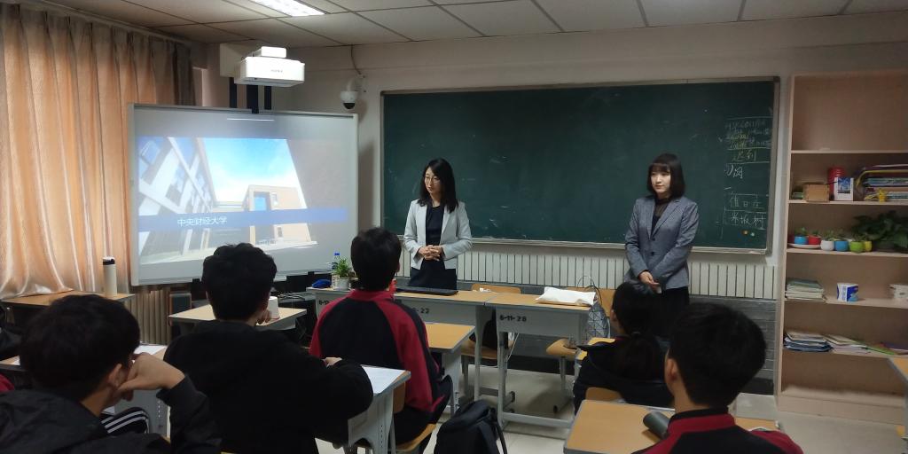 宣讲会由师大附中李梦老师主持,我院留学生招生办公室王亦丹、留学生管理办公室秋笛参加了本次活动。王亦丹和秋笛简要介绍了中央财经大学的学科优势、杰出校友、地理位置,并就同学们所关心的2020年本科留学生招生政策进行了详细解读。
