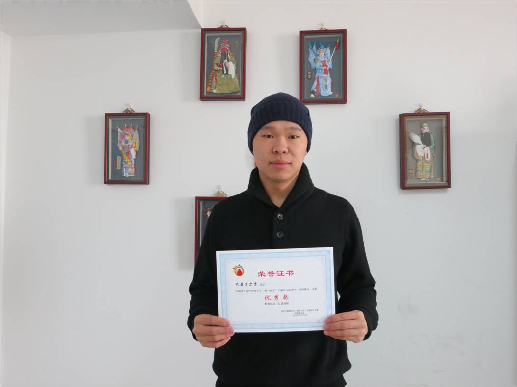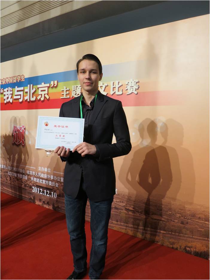 由北京市人民对外友好协会、北京市人民政府外事办公室、北京市教育委员会等单位联合主办的在“在京外国留学生‘我与北京’主题征文比赛”,12月10日晚在对外友协举办了隆重的颁奖仪式。在此次征文比赛中,我校2010级金融学专业本科留学生吉乐尔(哈萨克斯坦)荣获了二等奖,2011级国经贸专业本科留学生巴森道尔吉(蒙古)荣获了优秀奖,我校获得“优秀组织奖”。此次征文活动的主题就是来到北京,接受北京,融入北京。留学生们通过一篇篇饱含温情的作品,抒发了对北京的浓情厚意。