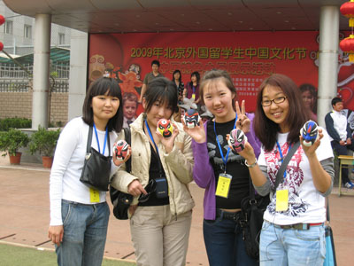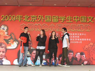 4月11日下午,我校70余名留学生参加了由北京市国际教育交流中心主办,北京国际汉语学院和北京市朝阳区芳草地国际学校联合承办的2009年北京外国留学生中国文化节——中国特色小屋展示”活动。在“泥人小屋”、“剪纸小屋”、“风筝小屋”等十个特色小屋中,大家零距离接触了中国文化。老师现场传授传统技艺,留学生们兴致勃勃地认真学习。活动结束时,大家拿着自己的作品,欣喜万分。中国传统文化带给了留学生新鲜的感受,使大家进一步加深了对中国的了解。留学生们希望以后能更多地参加此类活动。