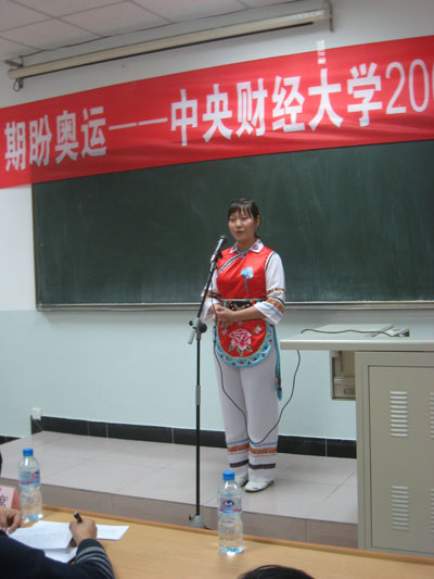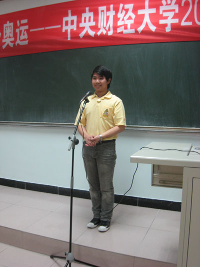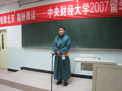 “相聚北京,期盼奥运——中央财经大学2007外国留学生汉语演讲比赛”12月19日在教学楼218教室举行。近三十名在我校学习的各国留学生用汉语深情讲述了他们留学北京、留学中财的感受,表达了他们对2008年北京奥运会的期盼。