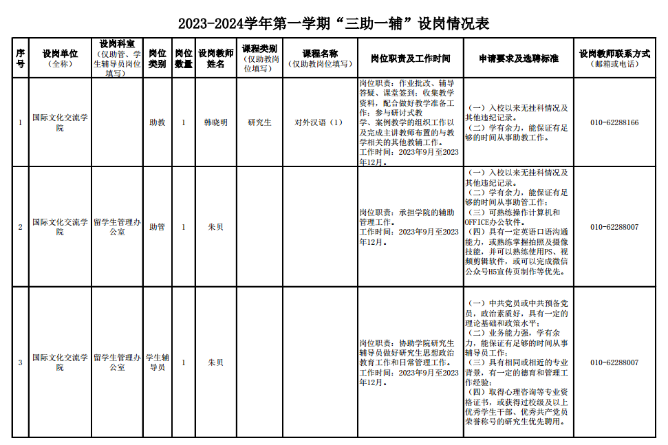 国际文化交流学院2023-2024学年第一学期“三助一辅”设岗情况