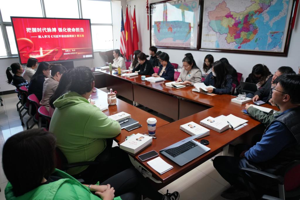 随后,朱贝就《习近平谈治国理政》第五卷第三章、第十四章和第十五章内容进行重点发言。她围绕“扩大高水平对外开放”“开创中国特色大国外交新局面”“推动构建人类命运共同体”三个方面分享了学习体会。她表示,在国际中文教育学习和工作中,要树立人类命运共同体意识,讲好中国故事,传播好中国声音,为促进中外文明交流互鉴,推动构建人类命运共同体贡献力量。