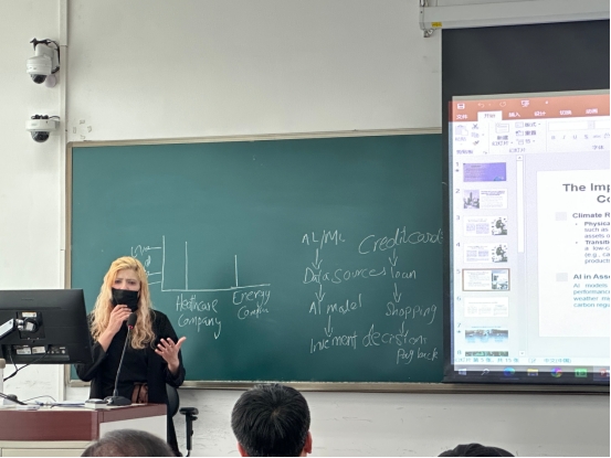 论坛首先由来自巴基斯坦的金融专业的博士研究生范笛玛(Fatima Batool)进行题为《金融在人工智能、机器学习与可持续性中的角色》的主旨分享。她从全球气候变化与环境、社会和治理(ESG)投资的趋势出发,深入剖析了人工智能和机器学习如何在现代金融体系中提供更智能的投资分析,推动绿色金融与可持续发展。她通过多个案例展示了AI在气候风险管理、ESG绩效评估和投资组合优化中的具体应用,引发了与会师生对金融与技术融合的广泛思考。