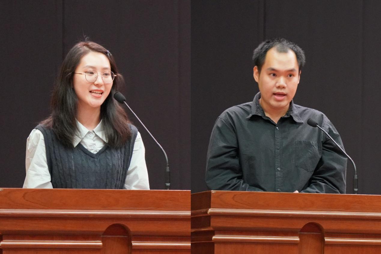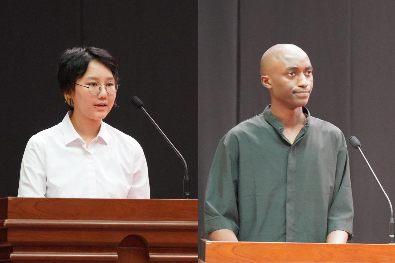 新生代表——2024级汉语国际教育硕士专业学位研究生邵诗荃和2023级预科留学生黄功勇发言。邵诗荃代表研究生新生郑重承诺将以严谨的态度,饱满的热情,投入到学习研究之中。黄功勇期待能在中财度过一段充实而有意义的青春岁月。