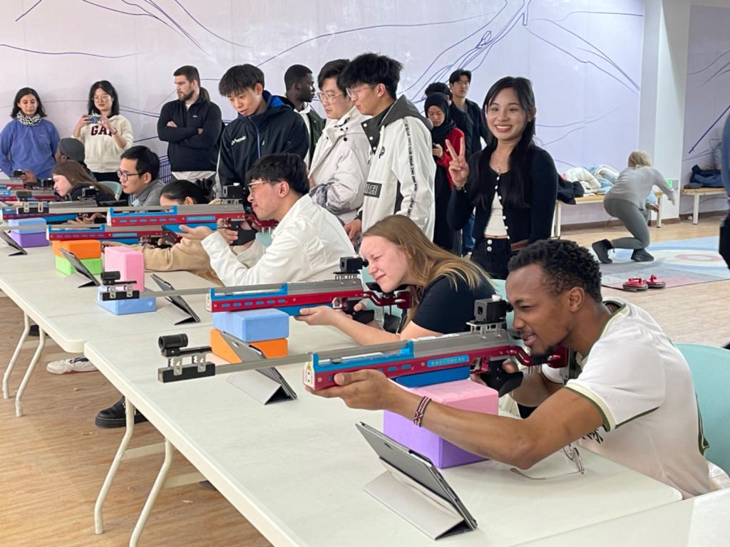 在国家冬季两项中心,同学们踊跃参与射击与陆地冰壶等运动项目,在合作与对抗中增进理解、加强交流。