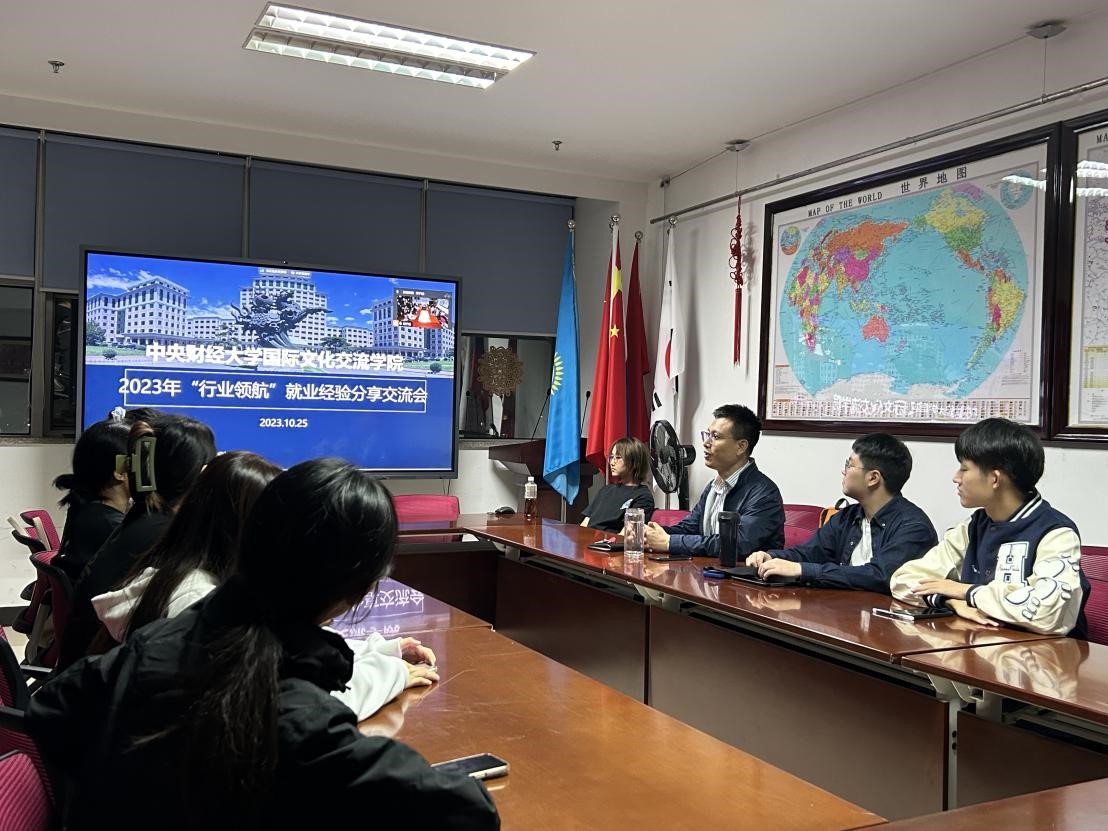 为帮助中外学生更好地掌握求职技巧,做好自身就业规划,有序办理就业业务,10月25日晚,我院举办了“行业领航”就业分享交流会暨就业业务办理说明会。本次会议采用线上线下相结合的方式,在腾讯会议和中财大厦10层1032室会议同时开展。国际文化交流学院副院长张碘、辅导员朱贝、校友代表杨雨萌、郭鑫、蔡蔷薇(留学生校友)以及40余名中外学生参加了本次会议。