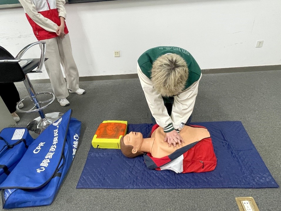 随后,急救部的同学利用道具示范了海姆立克急救法和心肺复苏的实际操作方法,有条不紊地指导国际学生进行相应的操作。来自柬埔寨的2022级本科生蔡宛燕表示,“我觉得校团委红十字会学生分会准备的所有培训内容都非常有趣,最重要的是急救部的同学们不仅给我们讲解理论知识,还通过实操让我们学到了在紧急情况下要采取什么样的急救方法”。