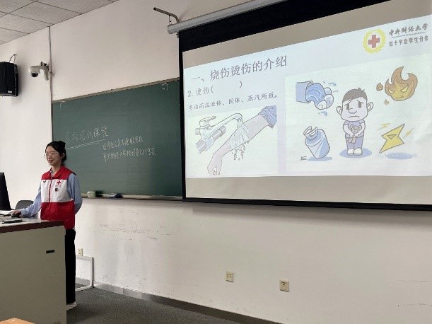 培训会上,急救部的同学们首先结合PPT,生动形象地为国际学生介绍了海姆立克急救法、创伤急救、烫伤烧伤急救、心肺复苏、中暑的预防及处理等相关知识和急救的措施。