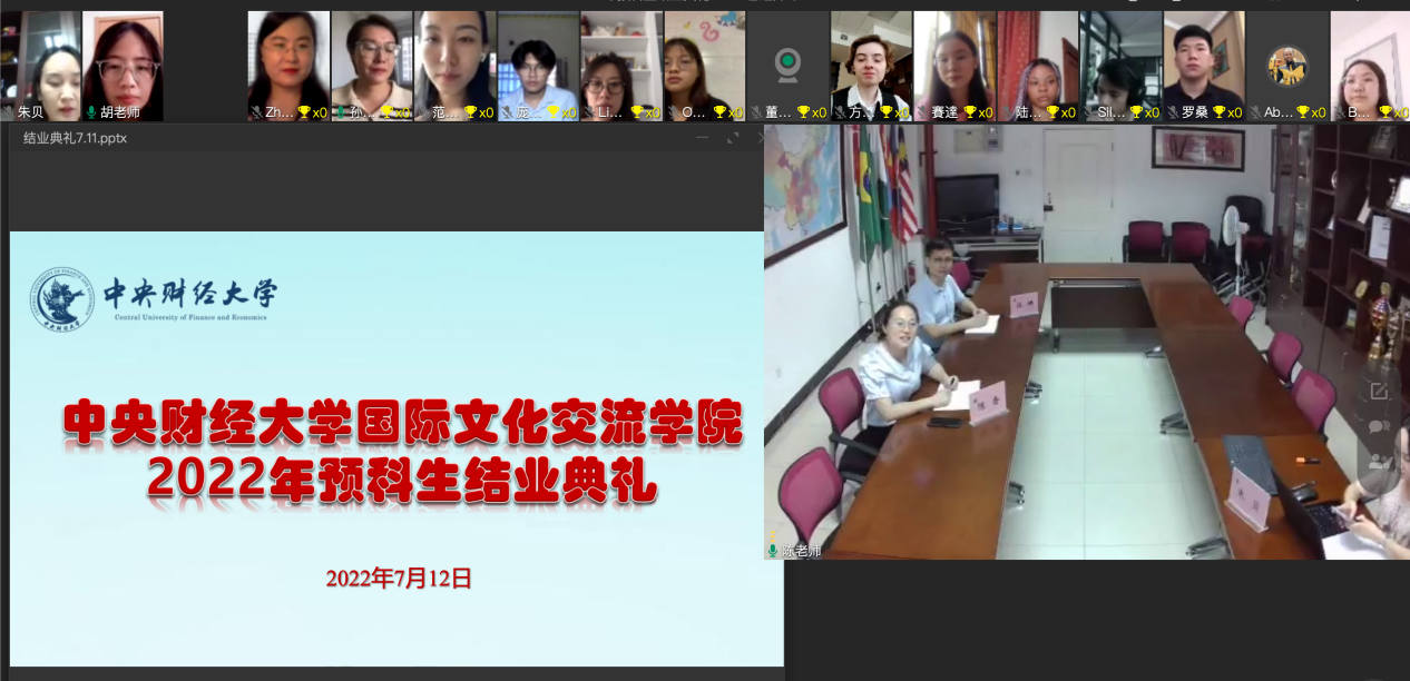 7月12日下午,中央财经大学2022届中国政府奖学金预科生结业典礼通过线上线下相结合的方式举行。国际文化交流学副院长陈香、张碘,全体预科教师,预科生辅导员以及全体2022届预科生参加了典礼。本次典礼由国际文化交流学院预科教师孙莉主持。