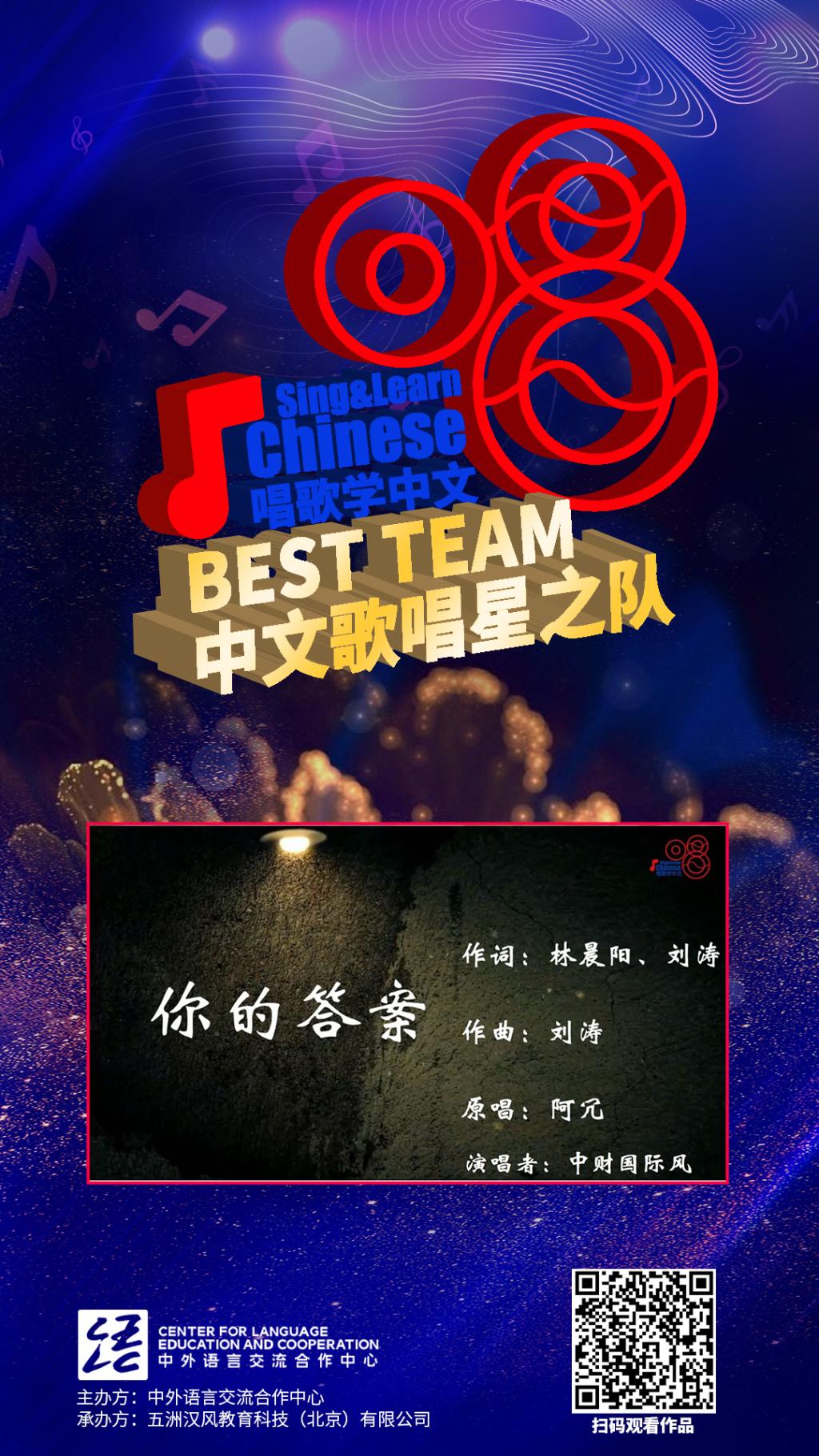 近日,由教育部中外语言交流合作中心主办,五洲汉风教育科技(北京)有限公司承办的2021年度“唱歌学中文”音乐视频全球征集活动圆满结束,全球57个国家上千名中文学习者提交了160部音乐视频作品。经过特邀专家组评审,最终入围作品68部,其中28部荣获单项奖。我校“中财国际风”组合演唱的中文歌曲《你的答案》荣获“中文歌唱星之队”奖项。