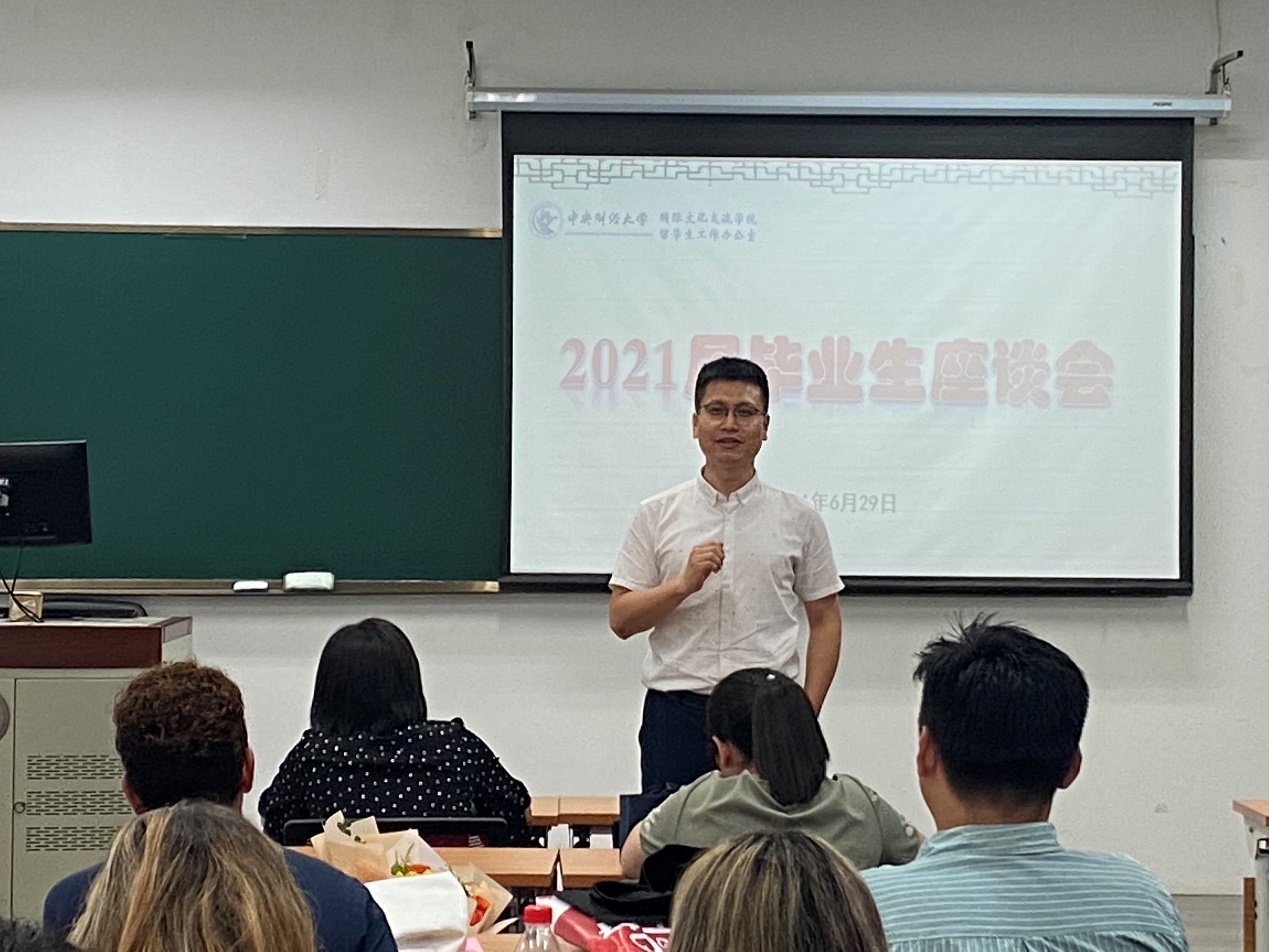 6月29日,2021届国际学生毕业生座谈会在中财大厦二层案例教室举行。国际文化交流学院副院长陈香、张碘,金融学院留学生工作联系人苏玉桃,留学生工作办公室部分管理人员,以及20余名2021届国际学生毕业生参加了此次会议。会议由留学生工作办公室丁国英主持。