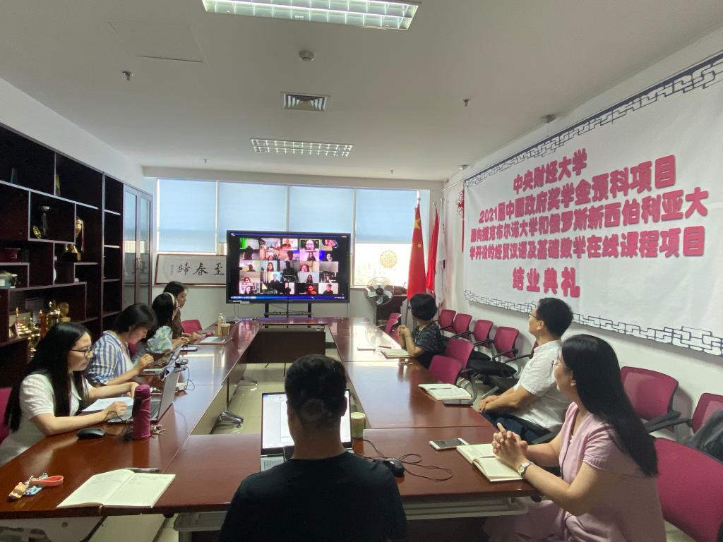 7月19日下午,中央财经大学2021届中国政府奖学金预科项目暨面向捷克布尔诺大学和俄罗斯新西伯利亚大学开设的经贸汉语及基础数学在线课程项目结业典礼在中财大厦1032会议室举行。本次典礼采用线上线下相结合的方式,国际文化交流学院院长李春玲,副院长陈香、张碘,全体预科教师、行政人员代表,2021届预科生及面向捷克布尔诺大学和俄罗斯新西伯利亚大学开设的经贸汉语及基础数学在线课程项目学员参加了典礼。典礼由预科教学部主任胡梦主持。