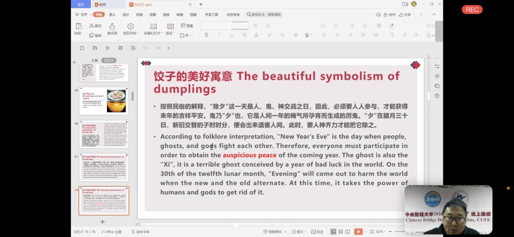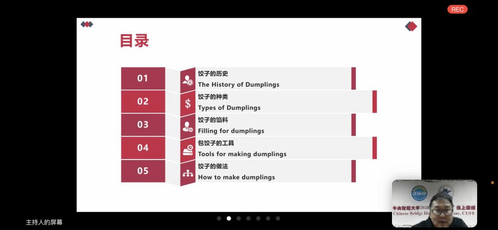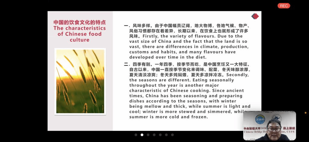 1月15日,中央财经大学2020年“汉语桥”线上团组项目中国文化体验系列课程—《中国饮食》在线上开讲。本次课程由中央财经大学王国庆教授主讲,来自巴西、蒙古和韩国的五十余名国际学生参加了此次课程。