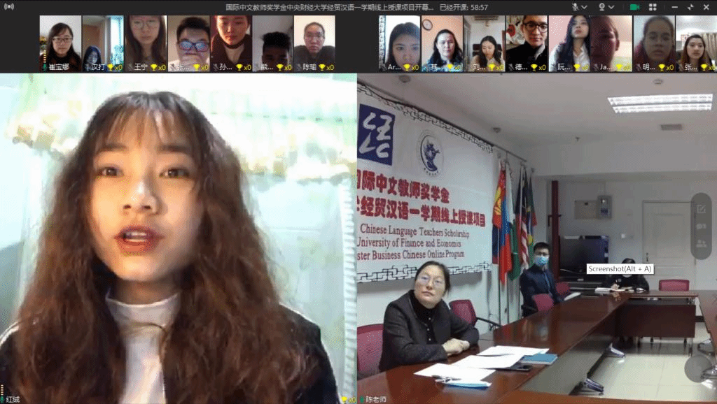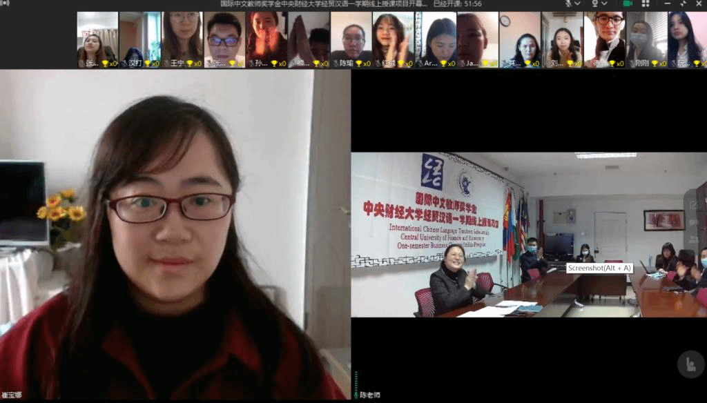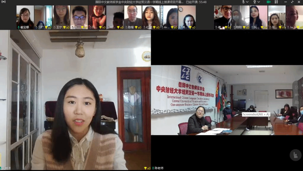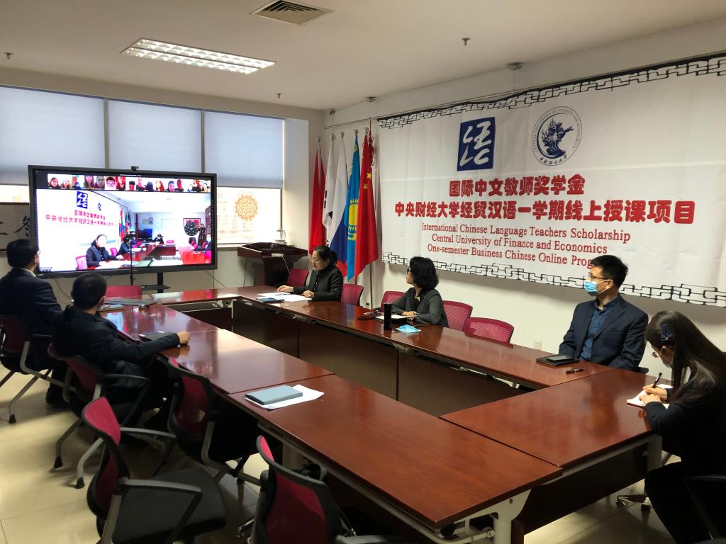 3月1日上午,由教育部中外语言交流合作中心主办,中央财经大学承办的2021年国际中文教师奖学金经贸汉语一学期线上授课项目开幕式在中财大厦1032会议室举行。项目全体教师和学生参加了线上线下相结合的开幕式。开幕式由国际文化交流学院副院长陈香主持。