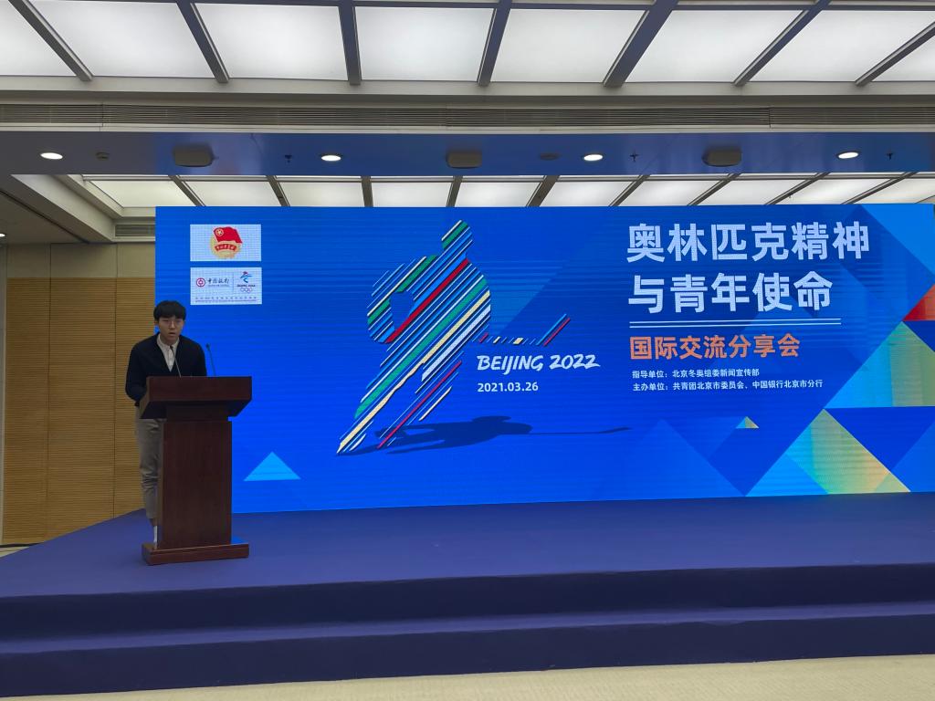 分享会上,与会嘉宾和参会者共同观看了北京2022年冬奥会和冬残奥会宣传片。中国银行北京市分行党委委员、副行长金瑜铭致欢迎词。共青团北京市委员会副书记李健发表了讲话。李健表示,今天的人类命运共同体,比以往任何时候都呼唤青年肩负起重任,希望大家增进相互了解、树立世界眼光、增强合作意识,努力为世界奉献一届精彩、非凡、卓越的奥运盛会贡献青年力量。在交流环节中,冬奥宣讲员刘晨、中国银行北京分行冬奥办公室高级经理刘迪、世界冠军张昊及国际青年代表相继发言。我校韩国籍学生郑煐勋和俄罗斯籍学生冯悦分享了自己与奥林匹克的故事,介绍了自己国家冰雪运动的开展情况。