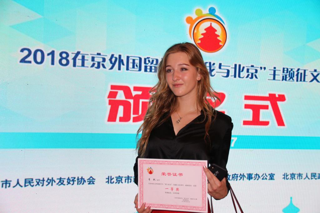 近日,由北京市人民对外友好协会、北京市教育委员会、北京市人民政府外事办公室、北京市人民政府新闻办公室主办的“2018在京外国留学生‘我与北京’主题征文比赛”举行了颁奖式。在27个国家487名在京留学生参加的征文比赛中,我校国经贸专业二年级本科留学生李飒同学的作文《我的中国心》荣获了一等奖,并且在颁奖式上代表获奖者发言。
