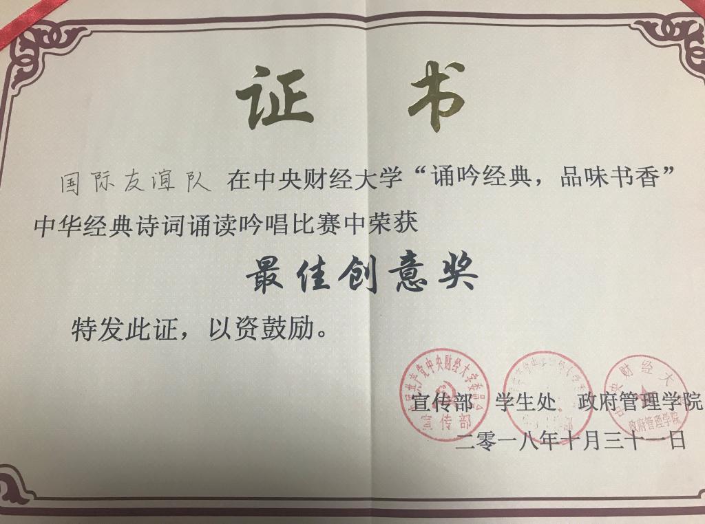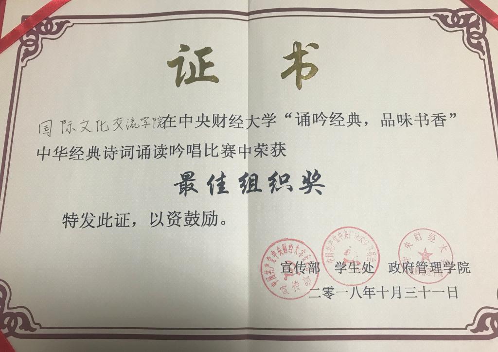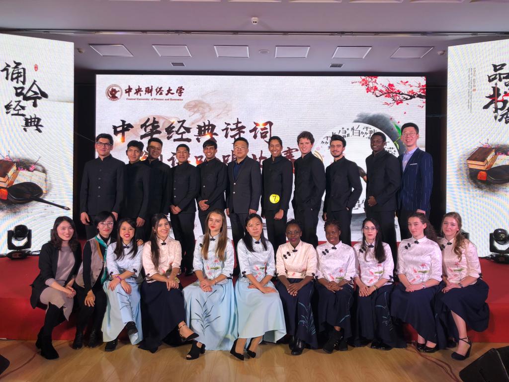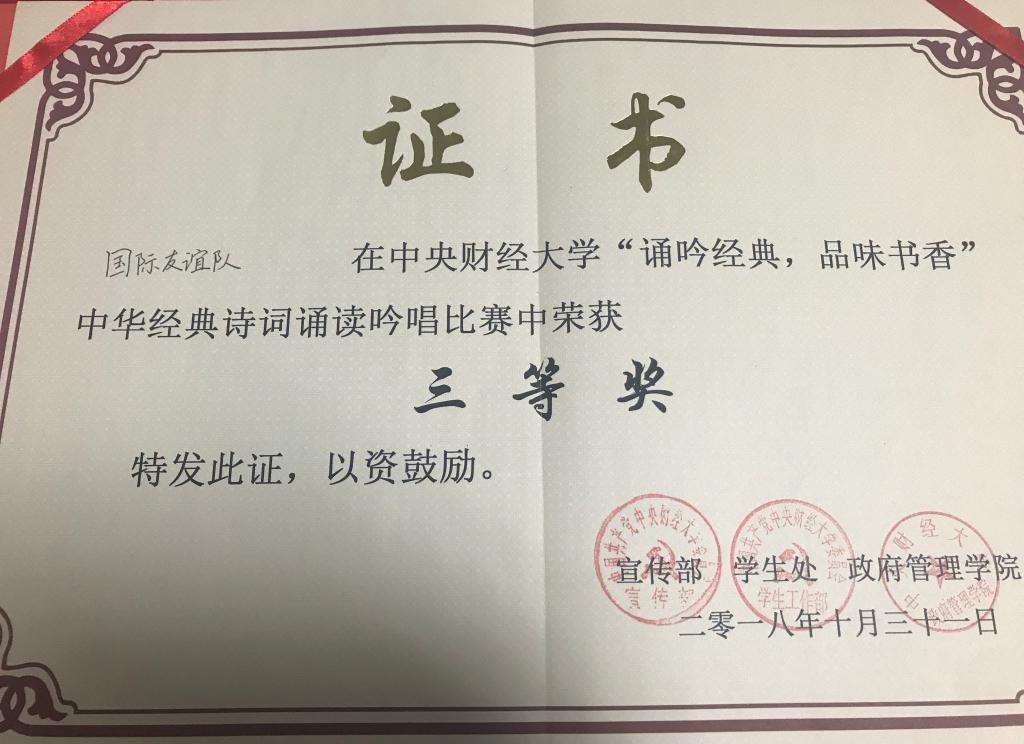 10月31日晚,由中央财经大学宣传部、学生处、政府管理学院联合主办的“诵吟经典·品味书香”中华经典诗词诵读吟唱比赛于图书馆配楼2层多功能厅举办,我院参赛队伍“国际友谊队”受邀参加。
