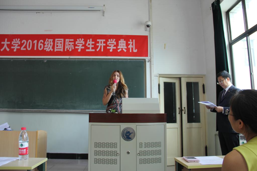 随后,老生代表、来自俄罗斯的2016级税务学专业硕士研究生莉卡同学发言,对新同学表示热烈欢迎。她说:“之所以选择继续在中财学习,不只是因为中财的专业优势和知名度,更因为:在这里遇到困难时有帮助;失去信心时有支持;思念父母时有体贴……中财已经成为我的第二个家”。莉卡还向国际新生介绍了自己学习、生活的经验与体会。