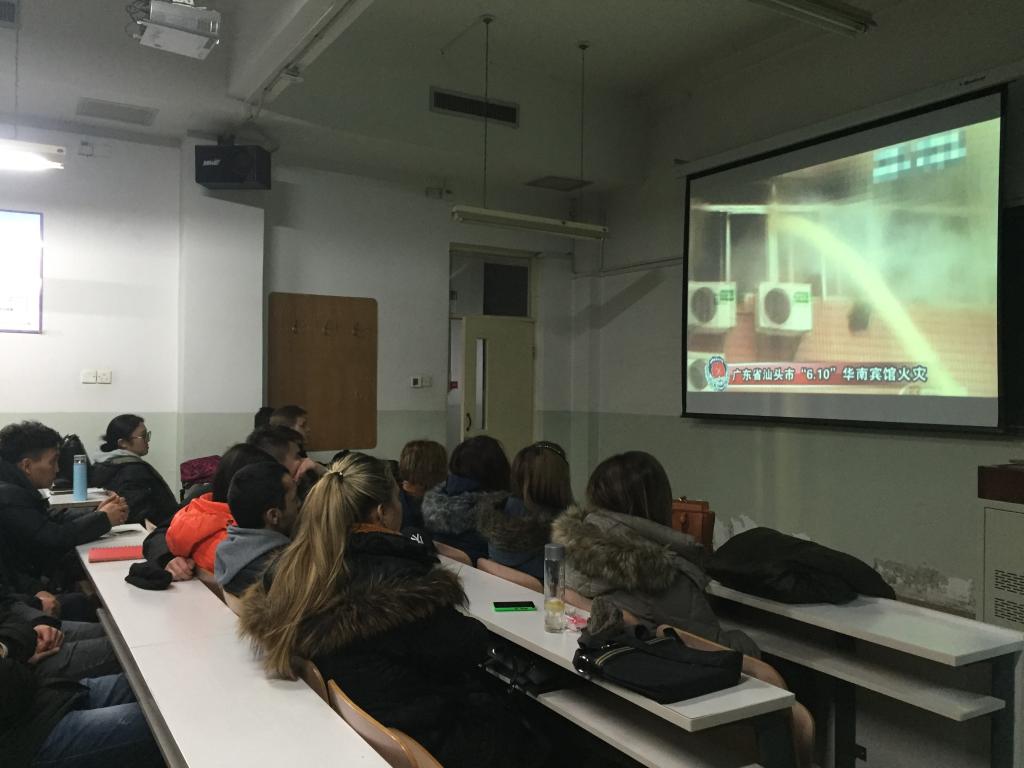 为进一步提高国际学生的消防安全意识,防止火灾的发生,12月3日,我院对国际学生进行了消防安全教育。通过让学生观看消防安全警示教育片,使学生认识到了火灾的危害和提高消防安全意识的重要性。同时,了解了火灾自救逃生知识。随后,留学生办公室对留学生公寓进行了检查,对检查中发现的隐患问题,要求学生立即进行改正。