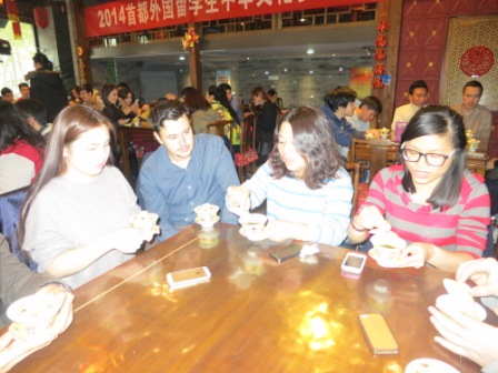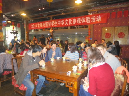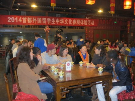 11月15日,我院部分国际学生参加了由北京市国际教育交流中心举办的“2014首都外国留学生中华文化参观体验活动”。留学生们来到了老舍茶馆,首先通过展览,了解了北京文化和老北京人的生活。随后在品茶中,观看了京剧、曲艺、杂技、功夫、皮影戏等的表演。留学生们无不为中国文化艺术的多样和精湛而赞叹。