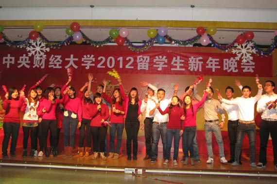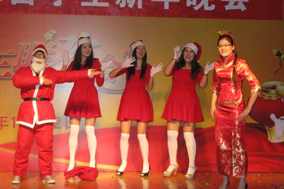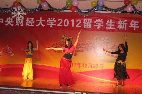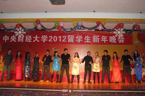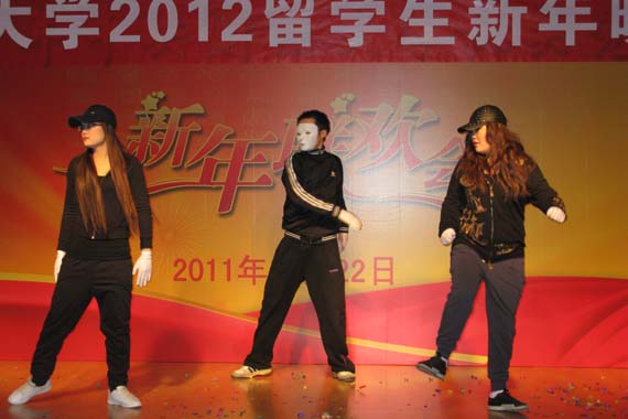 12月22日晚,我校2012年留学生新年晚会在教职工活动中心举行;来自十五个国家的在校国际学生载歌载舞,共迎圣诞,共庆新年。
