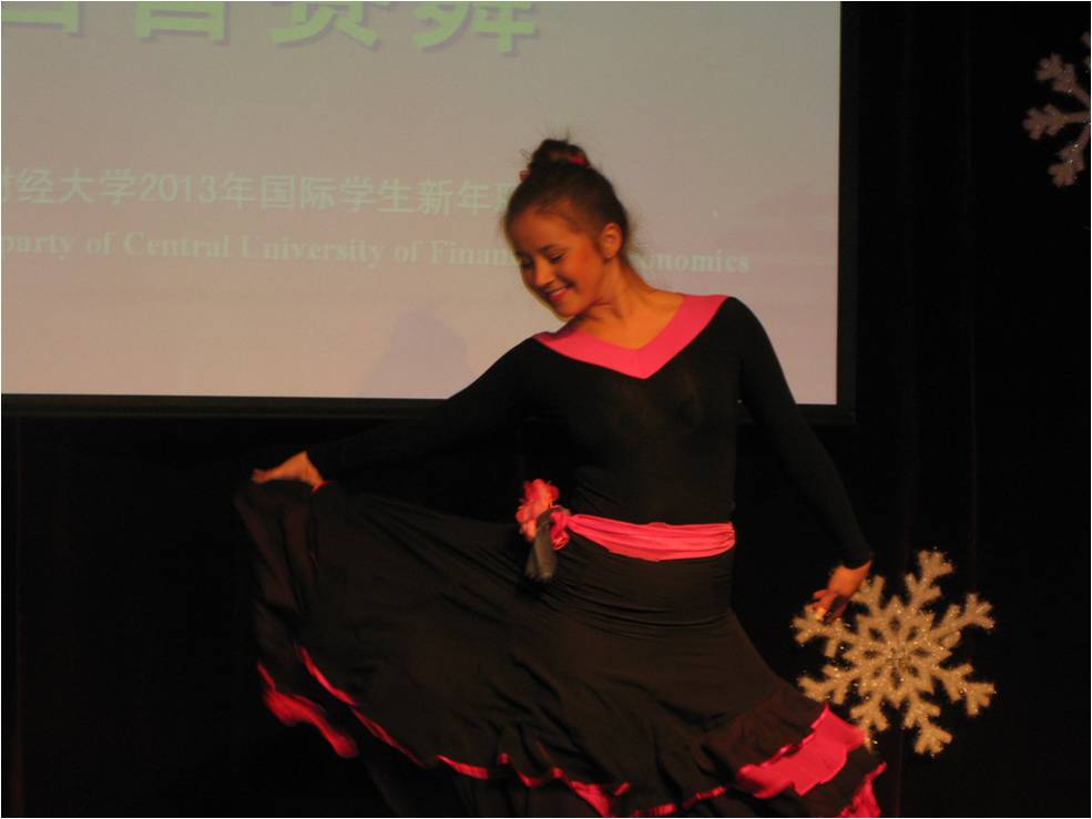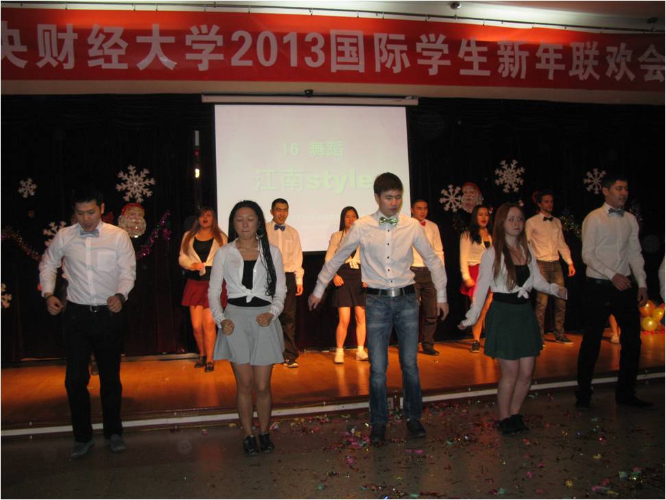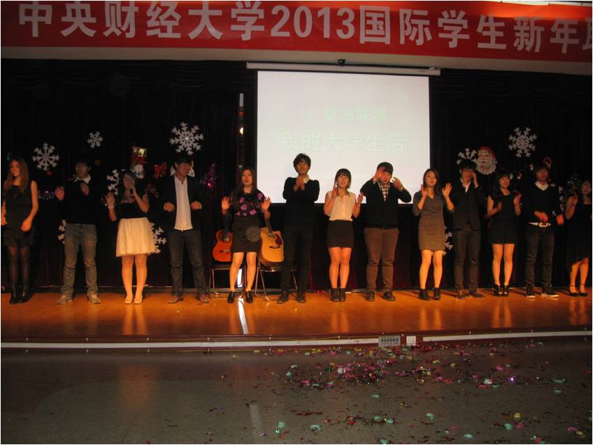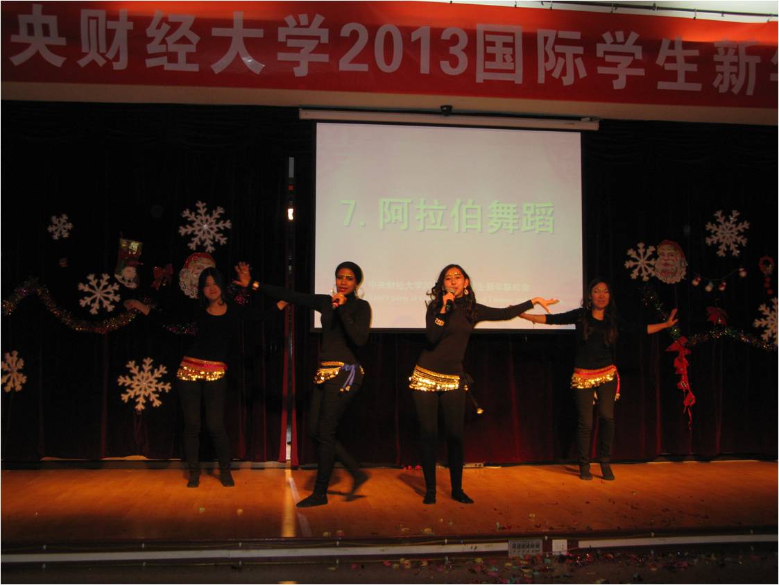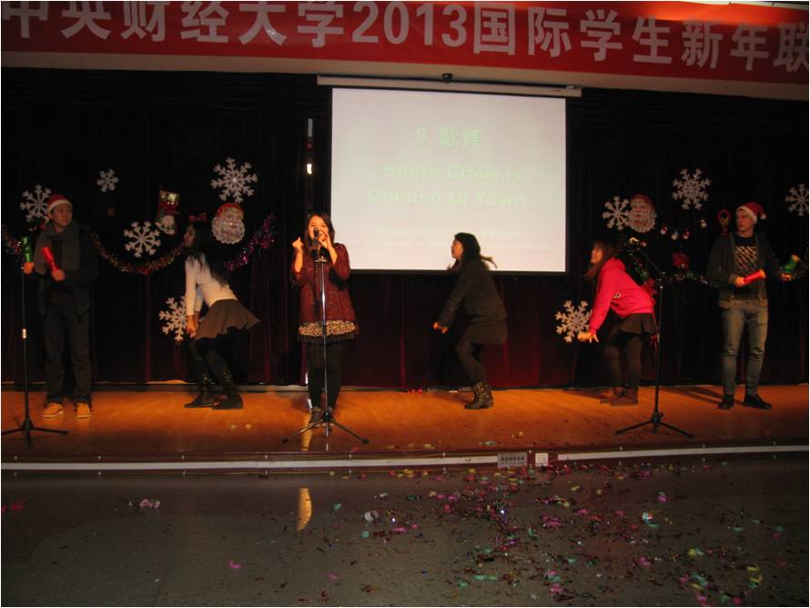 12月25日晚,“中央财经大学2013国际学生新年联欢会”在教工活动中心举行。在我校学习的来自近三十个国家的两百余名国际学生欢聚一堂,载歌载舞,共迎2013年的到来。无论是热情奔放的西班牙舞蹈、阿拉伯舞蹈,还是优美动听的《last Chrismas》、《我的歌声里》、《Santa claus is coming to town》、《we are young》、《明天会更好》以及表演唱《对不起,我的中文不好》,三句半《我爱中财》,小品《一节汉语课》,都给观众带来了阵阵掌声和笑声。国际文化交流学院院长张铁刚教授出席了晚会并做了新年致辞,学院全体老师也共祝留学生们新年快乐。最后,联欢会在风靡全球的舞蹈《江南stlyte》和《新年快乐》的歌声中结束。国际学生在此度过了一个欢乐难忘的圣诞之夜。