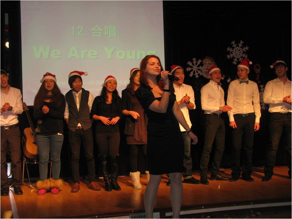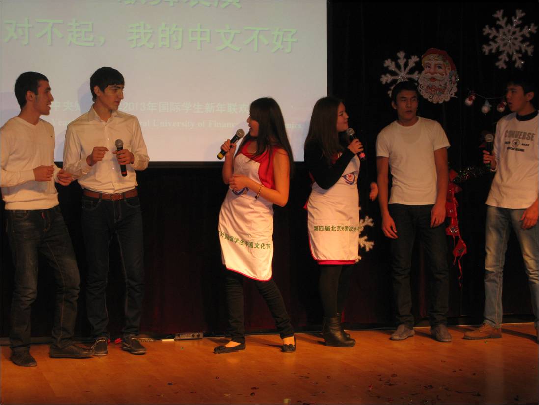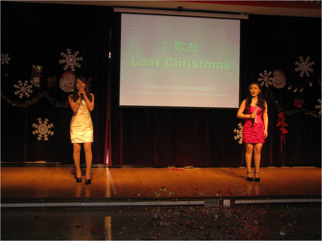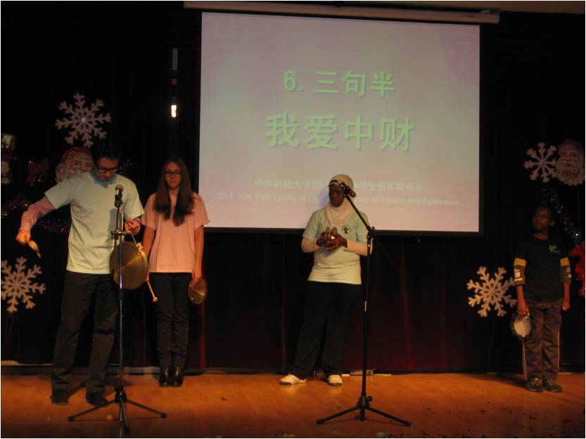 12月25日晚,“中央财经大学2013国际学生新年联欢会”在教工活动中心举行。在我校学习的来自近三十个国家的两百余名国际学生欢聚一堂,载歌载舞,共迎2013年的到来。无论是热情奔放的西班牙舞蹈、阿拉伯舞蹈,还是优美动听的《last Chrismas》、《我的歌声里》、《Santa claus is coming to town》、《we are young》、《明天会更好》以及表演唱《对不起,我的中文不好》,三句半《我爱中财》,小品《一节汉语课》,都给观众带来了阵阵掌声和笑声。国际文化交流学院院长张铁刚教授出席了晚会并做了新年致辞,学院全体老师也共祝留学生们新年快乐。最后,联欢会在风靡全球的舞蹈《江南stlyte》和《新年快乐》的歌声中结束。国际学生在此度过了一个欢乐难忘的圣诞之夜。