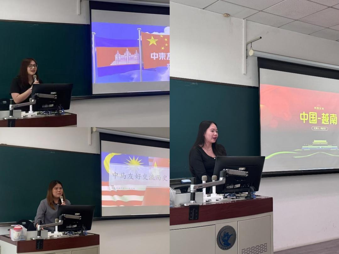 在主题交流分享环节,来自马来西亚、越南、柬埔寨的学生代表分别通过主题演讲的形式介绍了本国与中国在经济、文化、社会等方面的友好往来历史,让同学们感受到了各国与中国深厚的友谊渊源。随后,各国国际学生代表分享了他们在校期间的学习心得、生活体验等,增进了同学们之间的相互了解。中国学生代表也分享了参与本次活动的体会,从不同角度分享了跨文化交流的收获。