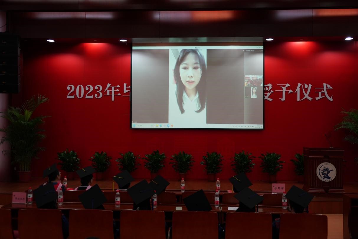2022届研究生校友单乐乐作为校友代表在线上发言。她表示,一段旅程的结束标志着另一段旅程的开始,毕业生此后要驶出避风港,独自乘风破浪,希望同学们永远具有勇往直前的勇气,迎风而上。