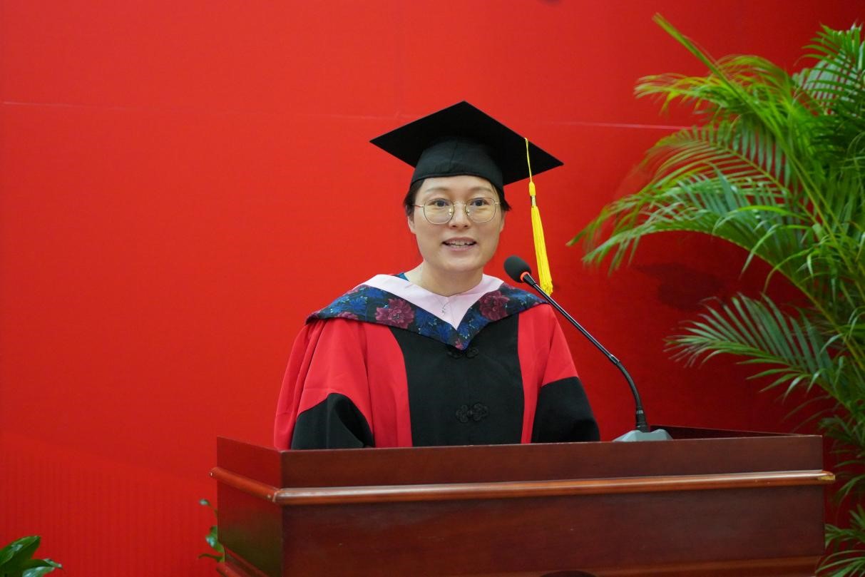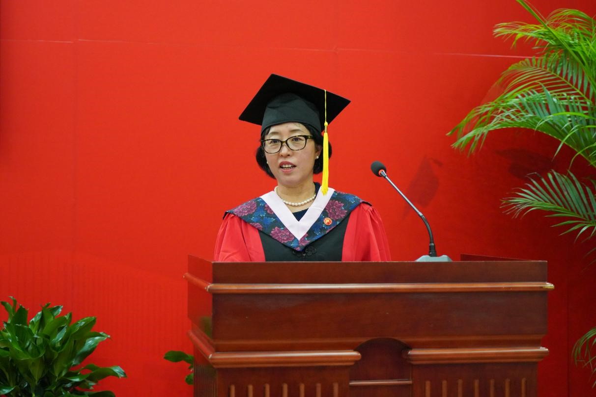 典礼伊始,李春玲院长致辞。她首先向顺利完成学业的全体毕业生表示热烈的祝贺,向研究生指导教师们表示衷心的感谢。在这即将分别的时刻,李春玲院长向毕业生们送上殷切的嘱托和期望。第一,健康是基础,身体是革命的本钱,希望同学们能够正视健康的重要性;第二,规矩是底线,无规矩不成方圆,工作、生活和做人都有一定的规矩,要做守规矩的人;第三,善良是根本,上善若水,而人有善恶两面性,要学会扬善抑恶,交友慎重,把善变成一种习惯;第四,诚信是人格,毕业后凡事要讲诚信;第五,勤奋是硬核,勤能补拙,希望毕业生们保持终身学习的好习惯;第六,执着是秘诀,要常立志,并且持之以恒地坚持下去,从而实现人生的大志,希望毕业生脚踏实地,注重过程,无论什么事都要做到无怨、无愧和无悔。