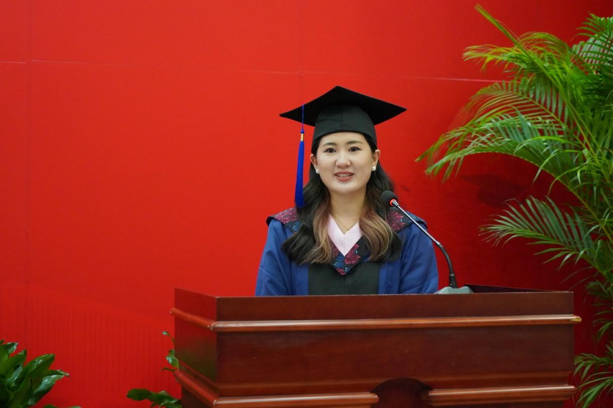 杨雨萌作为毕业生代表发言。她希望毕业生们能在社会中找到自己的位置,做拥有智慧并富有激情的人,心怀大志并脚踏实地的人,富有责任并敢于勇挑重担的人,以乐观和勤奋在未来的道路上继续破风前行。