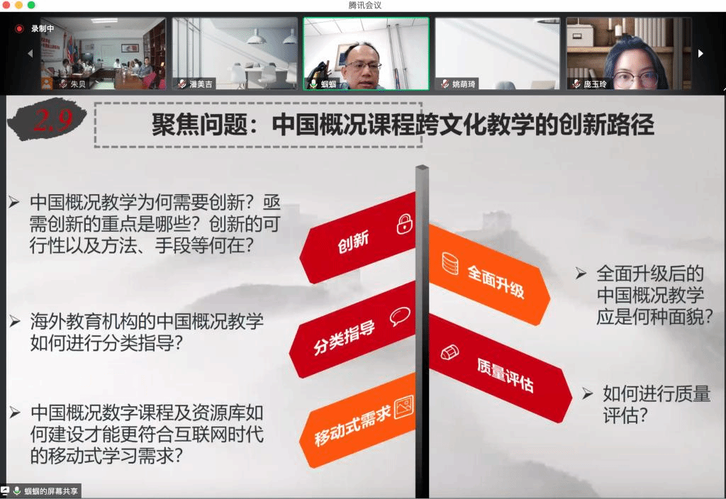 接下来,郭鹏教授从外语学习者的三个角度谈论了国情文化教学的内涵依据以及从语言中的文化含义和文化结构、语言中的交际文化、目的语知识文化,多元文化能力这四个层次讨论了国情文化教学与语言教学的关联。其次他指出应该加强对外中国概况的编写及教学研究,聚焦中国概况课程跨文化教学的创新路径。