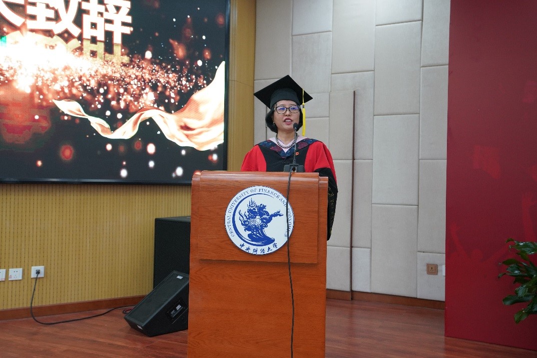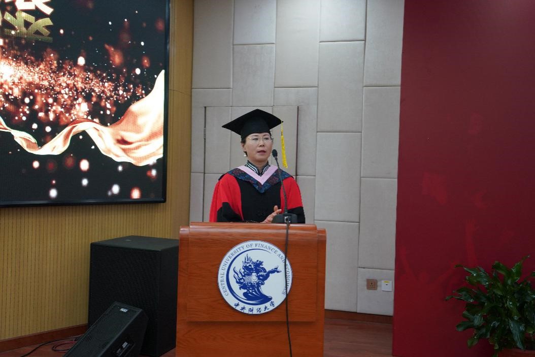 随后,院长李春玲教授代表学院向2021届全体毕业生致辞。李春玲院长指出,同学们在2019年中华人民共和国成立和中央财经大学建校70周年之际入学,在2021年中国共产党成立100周年毕业,宏大的历史背景为毕业生未来的道路涂抹了亮丽的色彩。她希望同学们成为一名 “至善者”“有志者”“感恩者”“终身学习者”“守时守信者”“责任担当者”,脚踏实地,持之以恒。