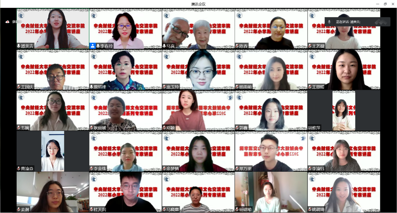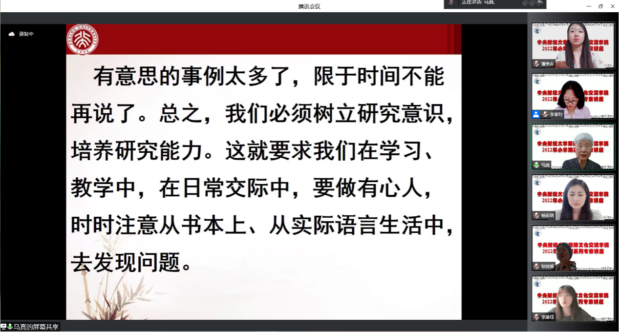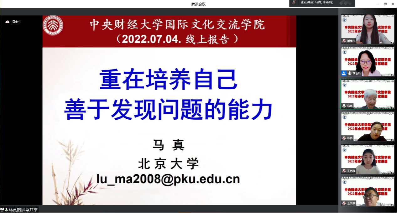 2022年7月4日上午,北京大学中文系马真教授在我院成功举办了“重在培养自己善于发现问题的能力”专题线上讲座,拉开我院2021-2022学年小学期汉语国际教育专业专家系列讲座的序幕。该场讲座通过腾讯会议平台举行,由国际文化交流学院院长李春玲教授主持。我院汉语国际教育专业全体硕士生导师、2021级和2022级汉语国际教育硕士专业学位研究生参加了此次讲座。