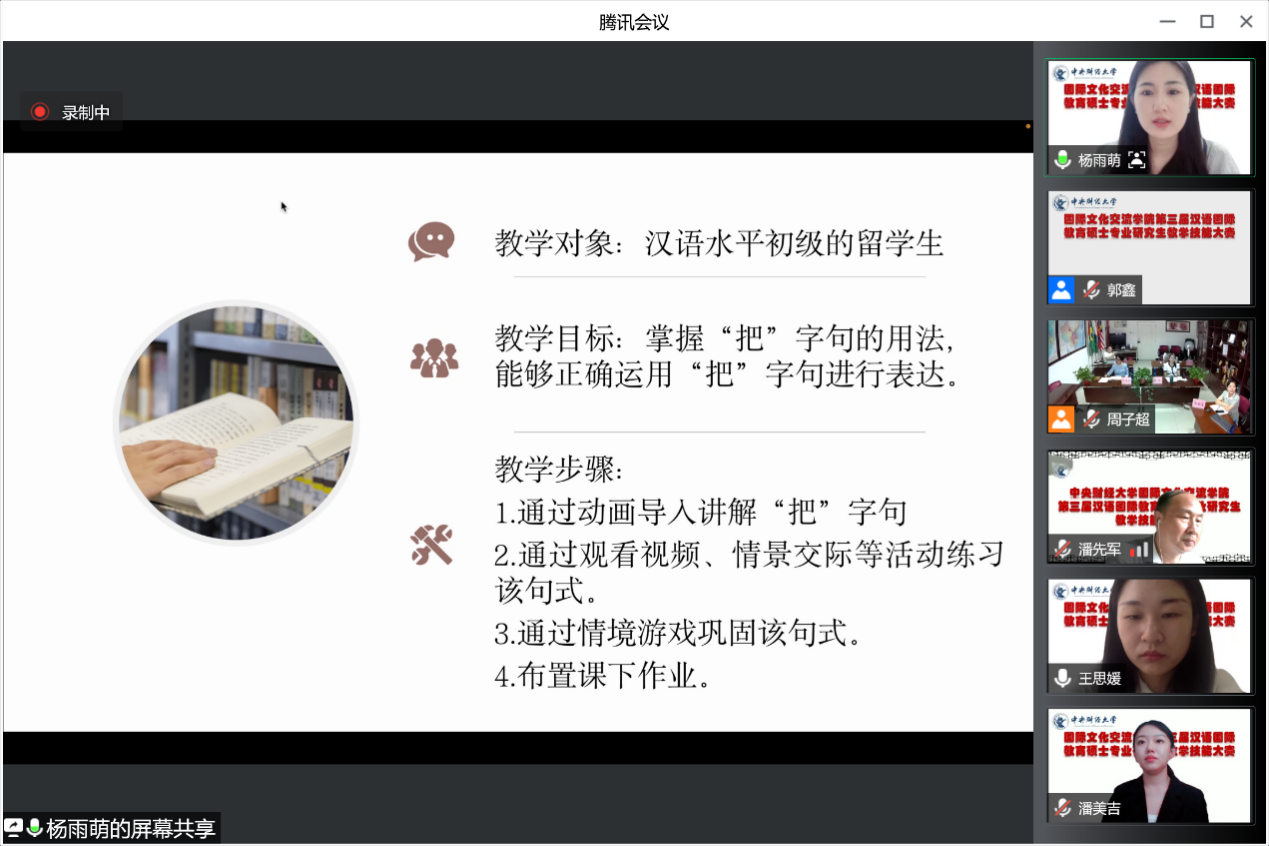 为进一步提高学院汉语国际教育专业硕士生的汉语教学水平,增强学生的教学能力,2022年7月11日下午,中央财经大学国际文化交流学院第三届汉语国际教育专业硕士研究生汉语教学技能大赛在腾讯会议上举行。本次比赛特邀北京第二外国语学院汉语学院潘先军教授担任评委会主席,特邀北京语言大学赵雷教授、北京语言大学赵菁副教授、首都师范大学国际文化学院林秀琴副教授和沈阳师范大学国际教育学院金学丽副教授担任评委。国际文化交流学院院长李春玲教授、原绍锋教授、王国庆教授、陈香副教授、王艺璇老师、韩晓明老师出席了本次比赛。本次比赛的参赛选手为2021级汉语国际教育专业全体研究生。2022级汉语国际教育专业硕士新生列席了这次比赛。