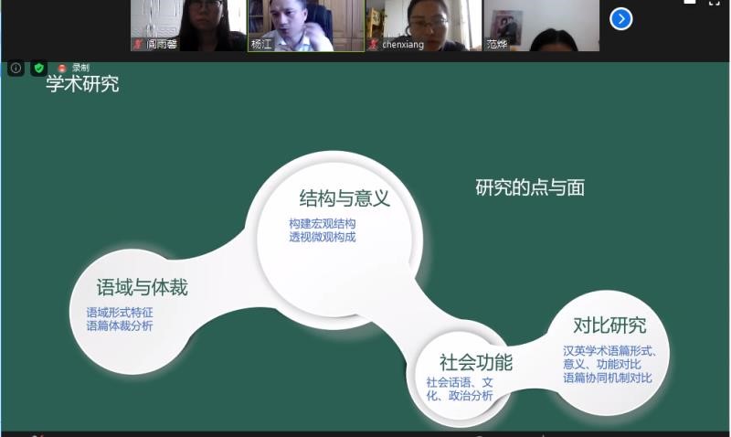 6月17日上午10点,湖南科技大学外国语学院的杨江副教授为我院师生开展了一场主题为“学术汉语语料库的创建与应用”的线上学术讲座。该讲座在ZOOM会议平台上举行,会议由我院陈香副院长主持,我院2019级汉语国际教育硕士生在线聆听了本次讲座。